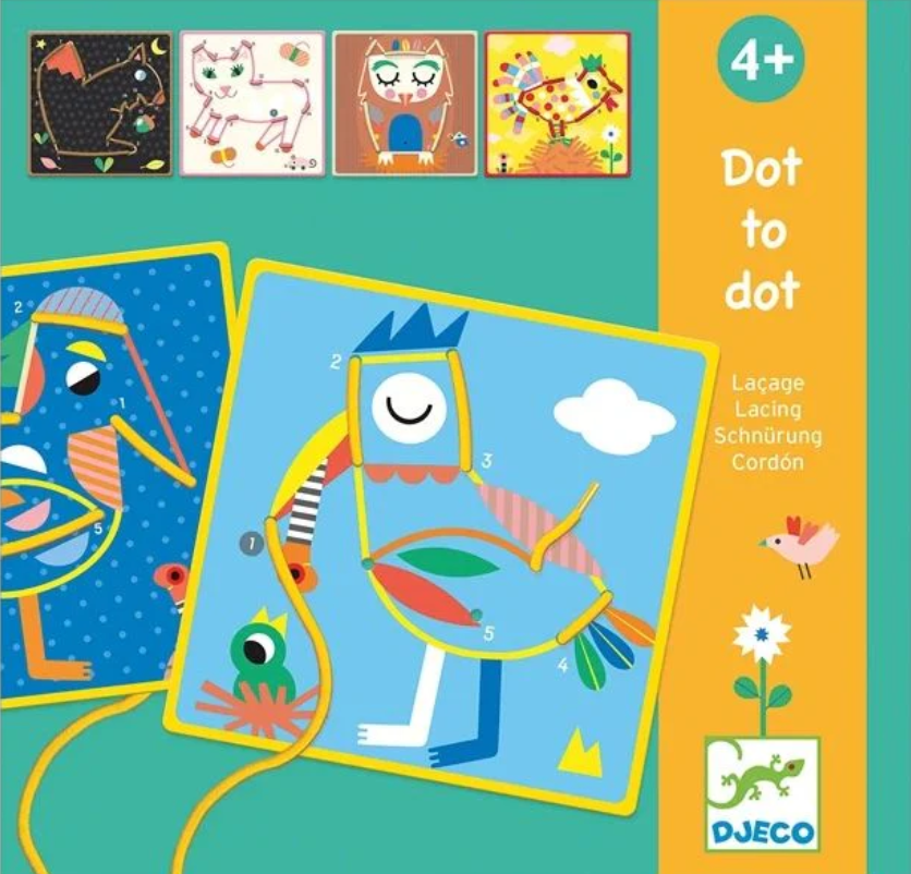 Dot to Dot – Schnürung ist ein Spiel mit zu verbindenden Punkten, das Kindern hilft, die Zahlenreihenfolge zu lernen und gleichzeitig ihre Feinmotorik zu verbessern. Mit einem bunten Schnürsenkel anstelle eines Stiftes bewegen sie sich von Loch zu Loch, um tolle Bilder zu kreieren. Die farbigen Umrisse erleichtern die Wahl des richtigen Schnürsenkels und offenbaren so ein Bild auf der Vorder- und Rückseite der Karte. Diese spielerische und pädagogische Aktivität fördert das Lernen von Zahlen und unterstützt gleichzeitig die Entwicklung der feinmotorischen Fähigkeiten.