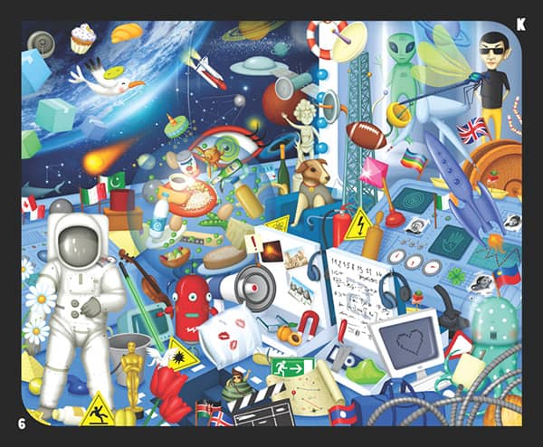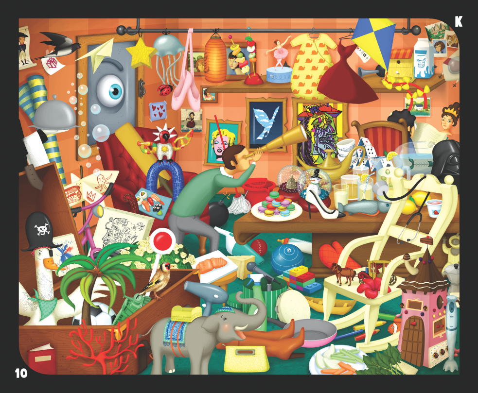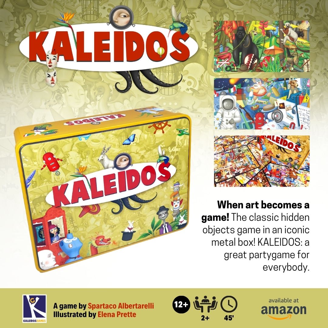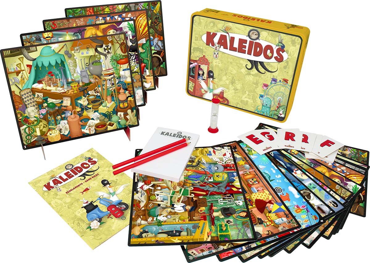 Das Spielziel von Kaleidos besteht darin, in den speziell angefertigten Bildern so viele Elemente wie möglich zu identifizieren, deren Namen mit einem zufällig ausgewählten Buchstaben beginnen. Jedes Bild enthält unzählige unterschiedliche Elemente, aber mit Fantasie können auch jene entdeckt werden, die nicht auf den ersten Blick sichtbar sind. Schnell, dynamisch und verpackt in einer eleganten Metallbox, ist es selbst für in Teams aufgeteilte größere Gruppen perfekt geeignet.
