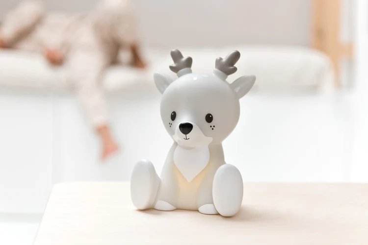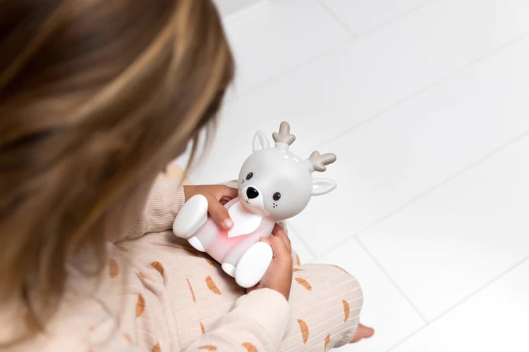Questa allegra luce notturna a LED è ricaricabile tramite USB e cambia colore toccando la sua parte posteriore. Puoi impostare la luce notturna perché si spenga automaticamente dopo 15 minuti o scegliere di lasciarla accesa tutta la notte, entrambe le opzioni sono disponibili tramite il pulsante di accensione/spegnimento. La sua texture morbida permette ai bambini di abbracciarla in sicurezza prima di essere cullati nel sonno!