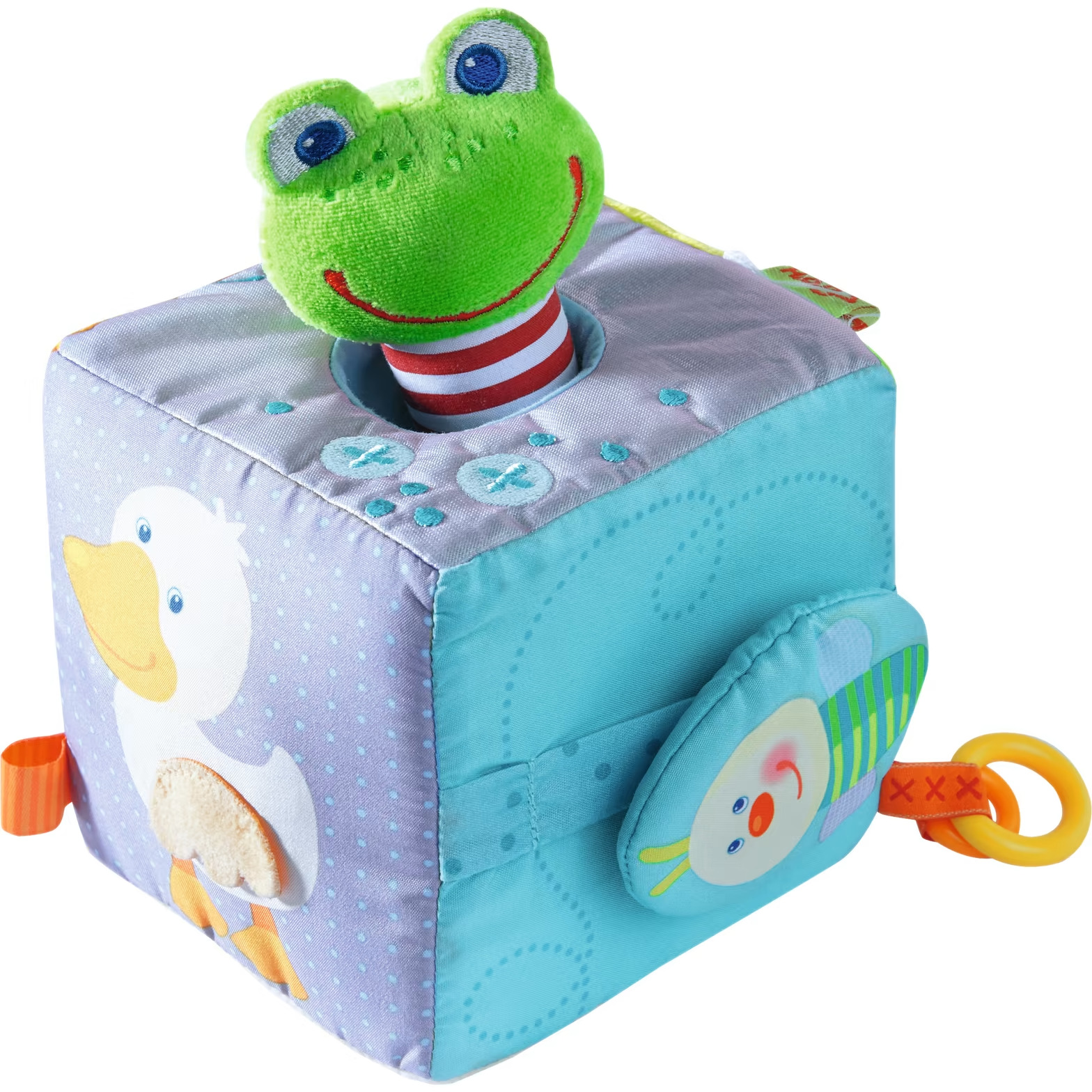 Il cubo gioco HABA Magic Frog è pieno di sorprese: la piccola rana dispettosa è ovunque, a volte si nasconde dietro foglie scricchiolanti, a volte fa un giro in macchina con la paperella girevole e a volte salta allegramente all'indietro quando viene tirata e rilasciata. Anche i suoi amici portano il buonumore: il simpatico bruco può essere spinto avanti e indietro e l'anatra squittisce allegramente quando gli si stringe il pancino. Esplorando e tastando, anche i più piccoli possono sviluppare la loro motricità fine in modo divertente. Il cubo gioco Magic Frog è un divertimento ingegnoso a casa e in viaggio, ideale per gli esploratori del mondo a partire dai 6 mesi.