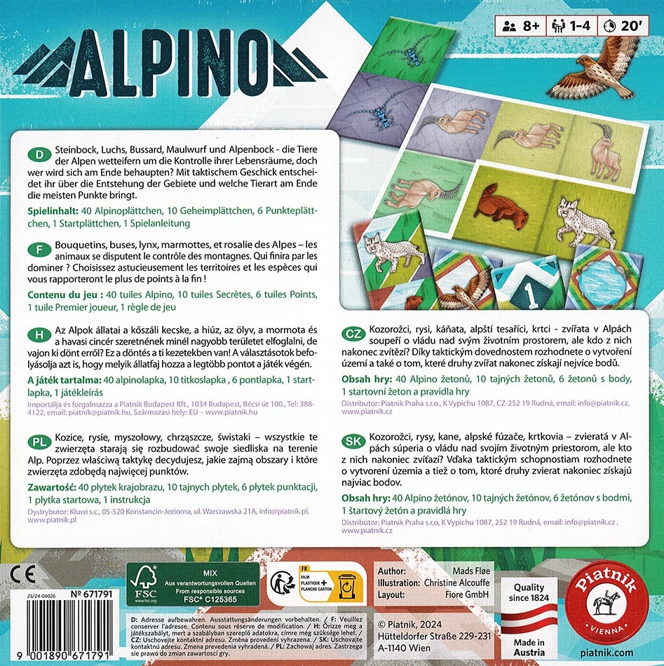 Dans le jeu Alpino, rivalisez pour le contrôle et la majorité des animaux alpins différents et influencez la valeur de chaque espèce animale avec vos choix. Dans ce jeu de pose de tuiles accessible de style « domino », c'est vous qui décidez : vous spécialisez-vous dans une espèce animale ou préférez-vous diversifier vos espèces pour tenter de maximiser vos points ? Les tuiles secrètes procurent de l'excitation jusqu'au dernier tour !