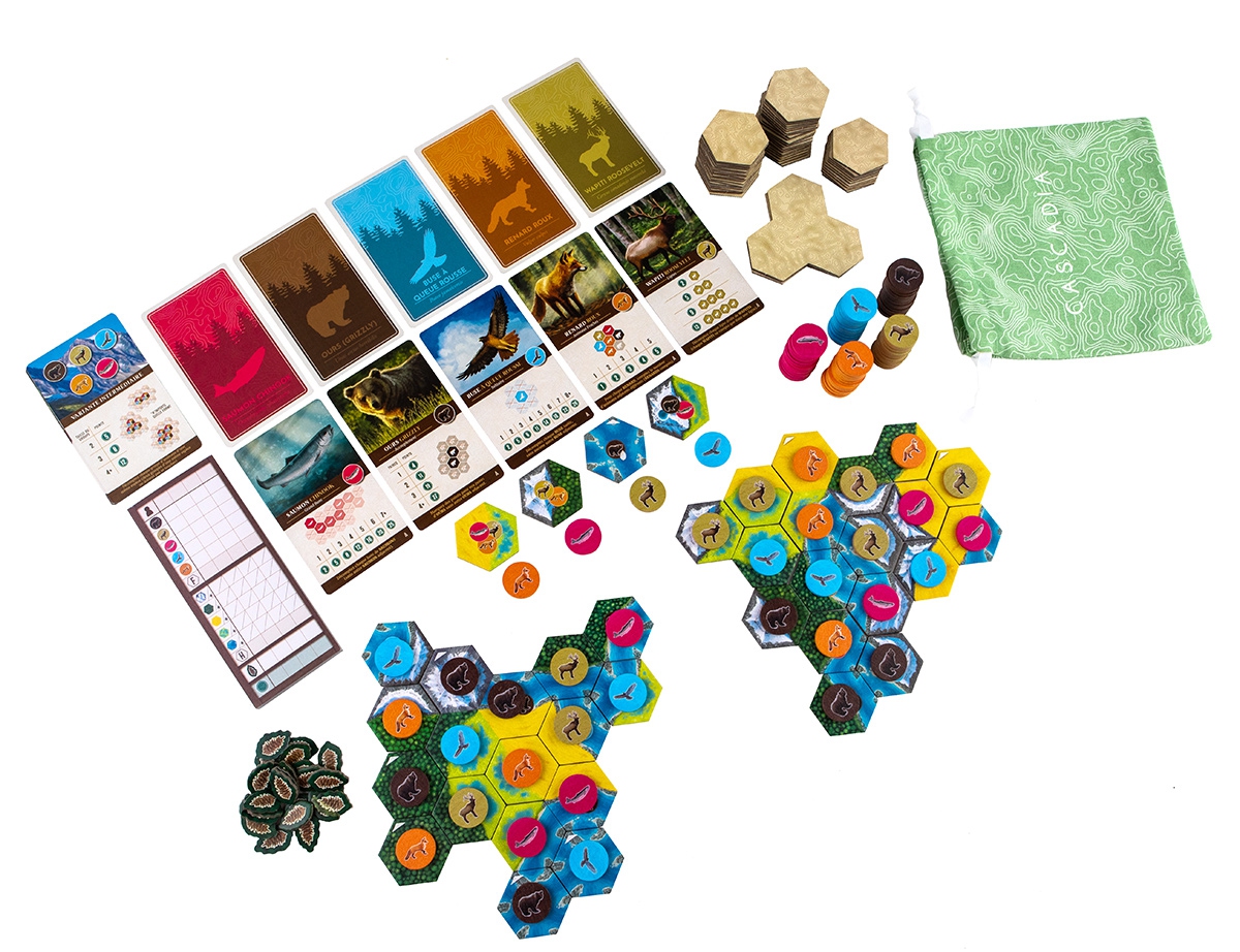 Cascadia est un jeu à base d’assemblage de tuiles et de draft de jetons mettant en scène les habitats et la vie sauvage du Nord-Ouest du Pacifique. Au fur et à mesure des tours, les joueurs construisent leur propre zone de terrain et la peuplent avec la faune disponible.