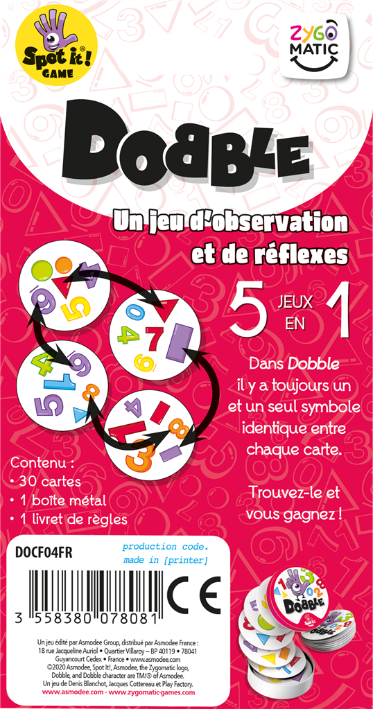 55 cartes comportant chacune six chiffres ou formes géométriques, 5 variantes… et c’est parti !