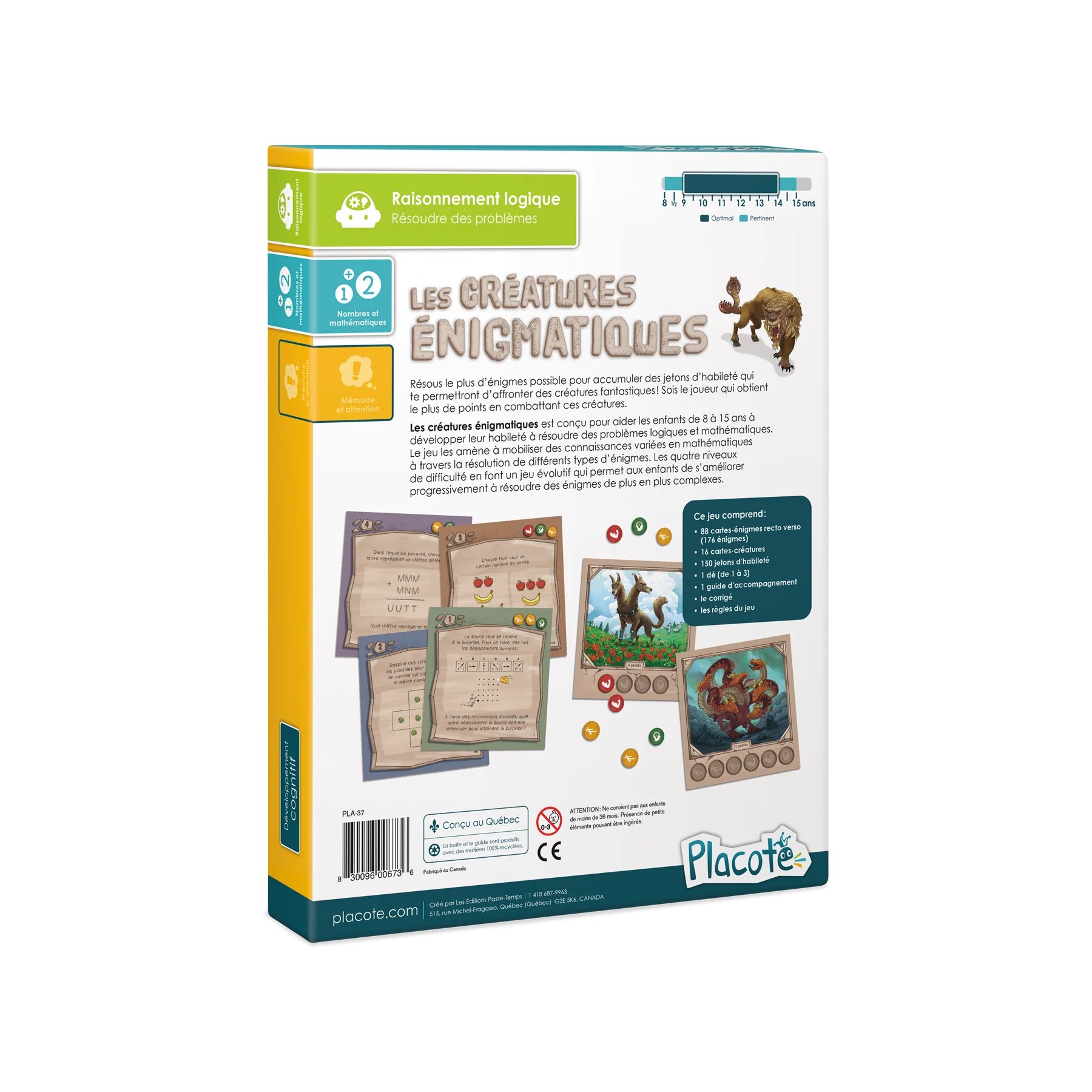 Les créatures énigmatiques est conçu pour aider les enfants de 8 à 15 ans à développer leur habileté à résoudre des problèmes logiques et mathématiques. Le jeu les amène à mobiliser des connaissances variées en mathématiques à travers la résolution de différents types d’énigmes. Les quatre niveaux de difficulté en font un jeu évolutif qui permet aux enfants de s’améliorer progressivement à résoudre des énigmes de plus en plus complexes.
