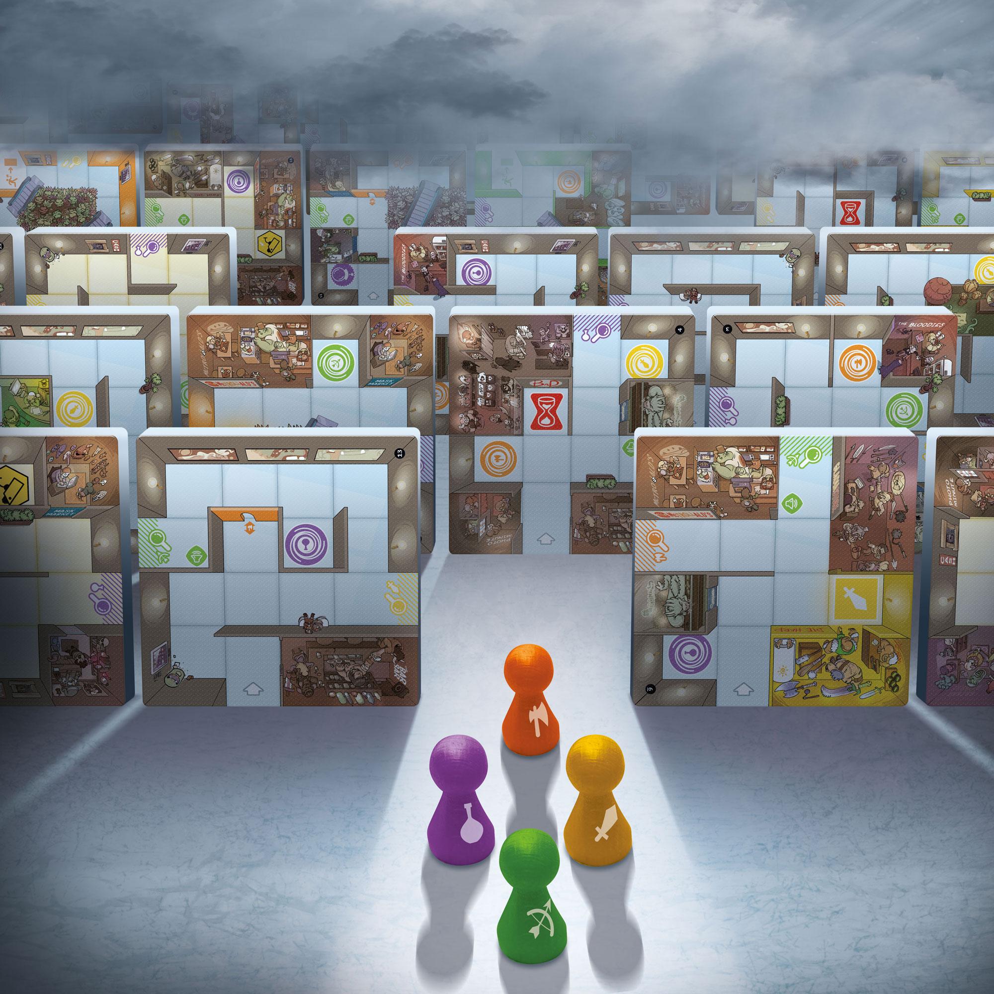 Après avoir été dépouillés de tous leurs biens, une magicienne, un barbare, un elfe et un nain se voient contraints d’aller dérober au Magic Maze – le centre commercial du coin – tout l’équipement nécessaire pour leur prochaine aventure. Ils se mettent d’accord pour commettre leur larcin simultanément avant de détaler vers les sorties afin ­d’échapper aux vigiles, qui les ont à l’œil depuis leur arrivée.