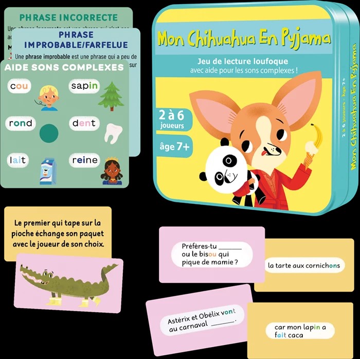 Mon chihuahua en pyjama est un jeu de lecture loufoque et décalé qui permet aux élèves de l’école primaire d’explorer et de renforcer leurs compétences en lecture tout en s’amusant.