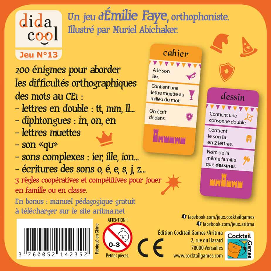 Le jeu propose 3 règles de jeu (Quiz, Quiz par équipes et le Pendu). Les cartes sont organisées en 6 séries qui permettent chacune de travailler une famille de difficultés orthographiques différente.
