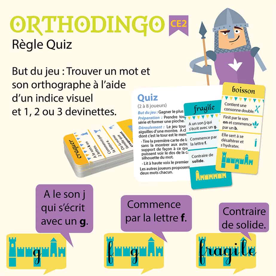 Le jeu propose 3 règles de jeu (Quiz, Quiz par équipes et le Pendu). Les cartes sont organisées en 6 séries qui permettent chacune de travailler une famille de difficultés orthographiques différente.