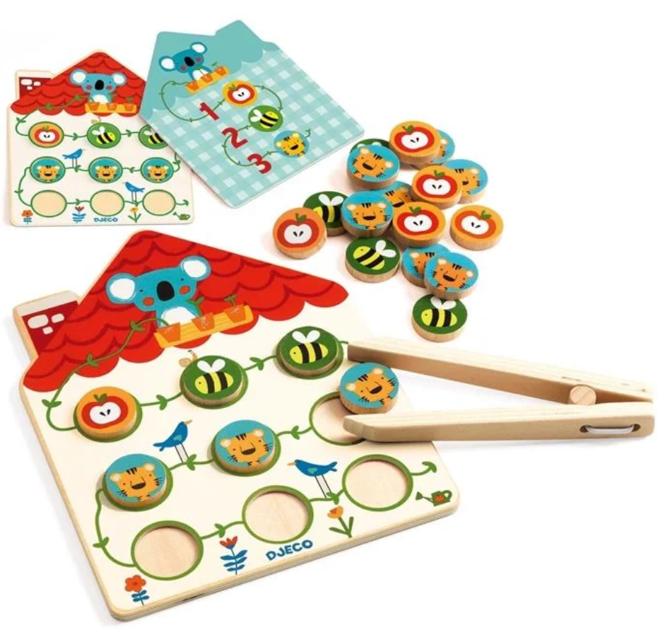 Pinstou est un jeu de comptage et de coordination. Le koala donne les instructions et l'enfant utilise une pince à épiler pour placer le bon nombre d'éléments sur le tableau. Il y a des photos de la solution au dos des cartes !