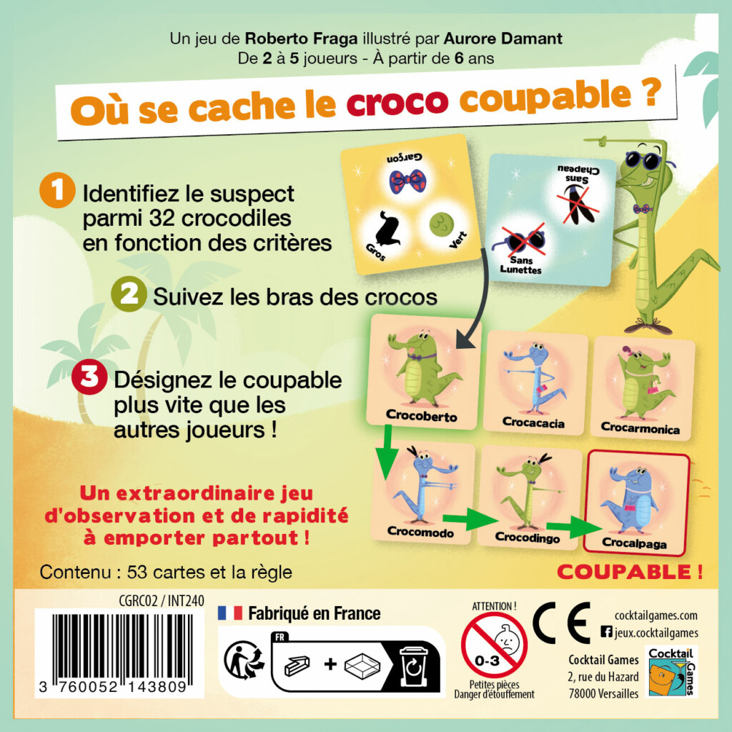 Un cambriolage a été commis et pas moins de 32 crocodiles sont suspects. L’ordinateur de la police diffuse un portrait-robot qui va vous permettre de retrouver le plus vite possible le croco coupable. Mais attention, après avoir identifié le croco suspect, il va falloir suivre la direction pointée par les bras des crocos, pour débusquer le coupable.
