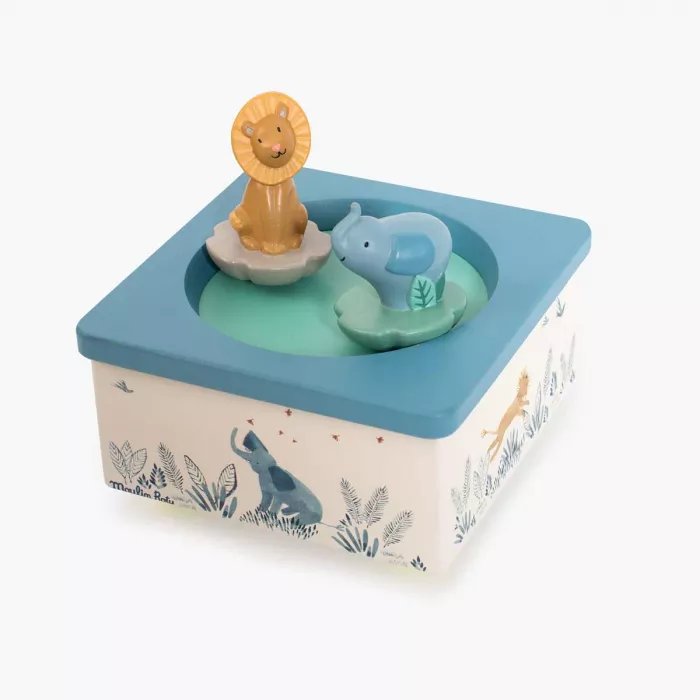 Boîte à musique couleur crème, reprenant les illustrations de l'éléphant et du lion au milieu de la savane. Les deux personnages tournent et dansent sur une jolie musique pour endormir bébé.