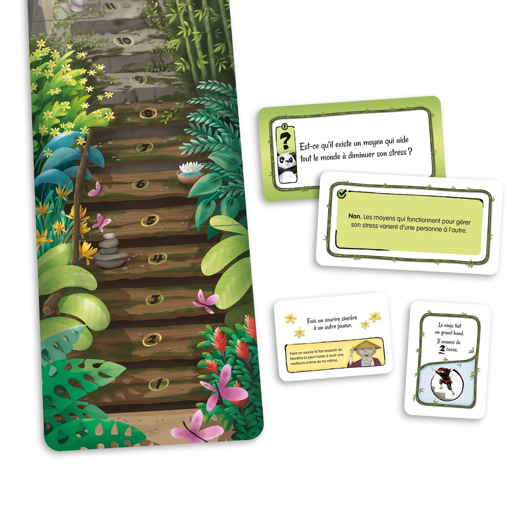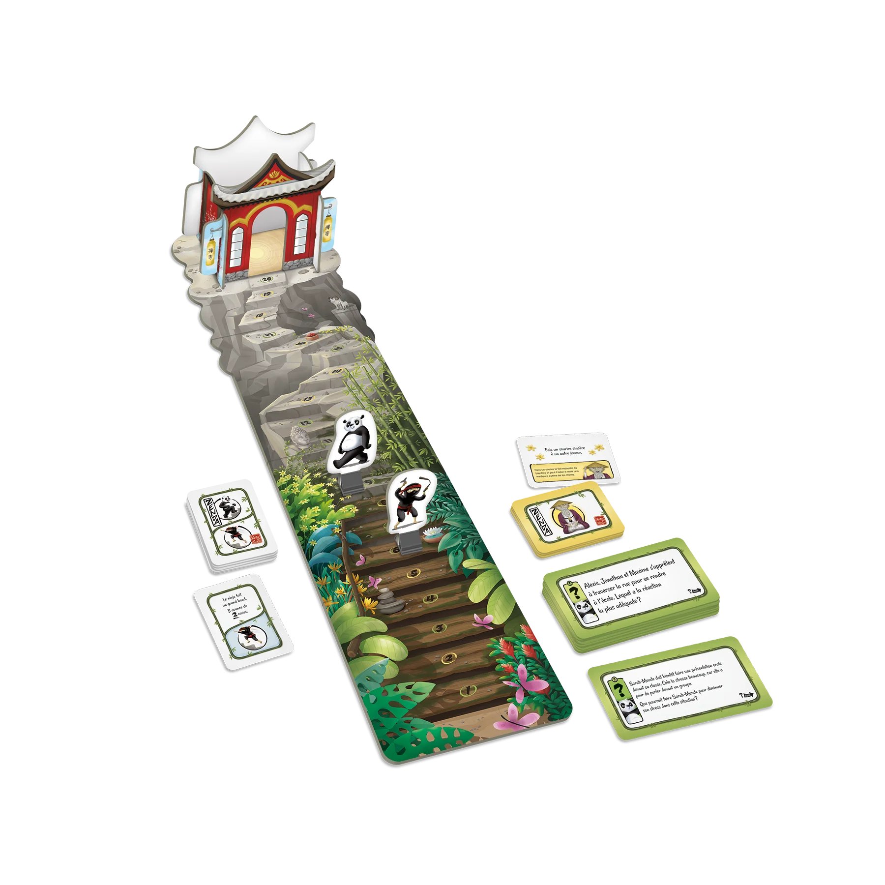 Participe aux questions et aux « défis zen » pour aider Zenda à atteindre le temple. Mais attention, tu dois arriver au bout du parcours avant le ninja, qui symbolise le stress !